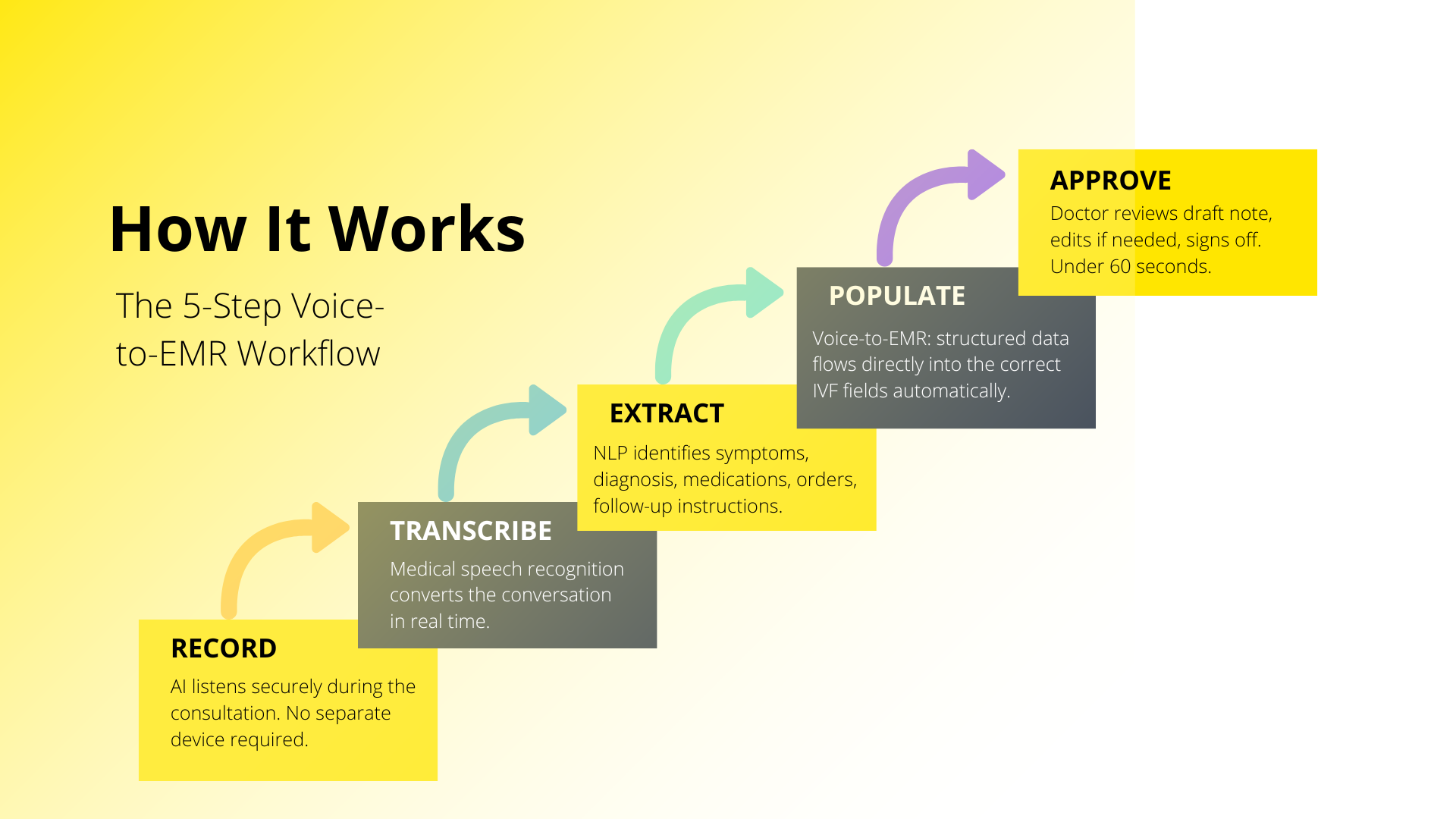 An AI medical scribe for IVF is an ambient listening tool that sits quietly in the background of a live consultation. It securely captures the doctor–patient conversation, transcribes it in real time using medical-grade speech recognition, the same voice-to-EMR software now used by leading health systems globally, and applies natural language processing to extract clinically relevant data, automatically populating structured fields in the clinic’s EMR. No typing. No dictating. No interrupting the flow of care.