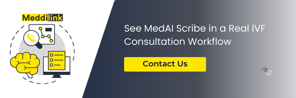 MedAI Scribe is Meddilink’s AI medical scribe for IVF clinics, built natively inside the MedART EMR, the clinical management platform designed specifically for IVF and ART practices. It supports the complete fertility clinic workflow automation lifecycle: from voice-to-EMR transcription during consultation to structured embryology records and outcomes reporting, all without a single manual step.